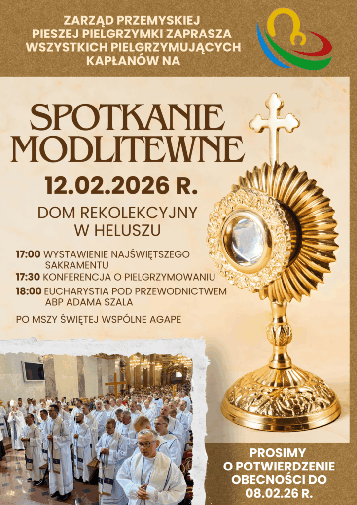 Zarząd Przemyskiej Pieszej Pielgrzymki zaprasza wszystkich kapłanów związanych z Przemyską Pieszą Pielgrzymką na Jasną Górę na Spotkanie Modlitewne, które odbędzie się 12 lutego 2026 r. w Ośrodku rekolekcyjnym w Heluszu.
