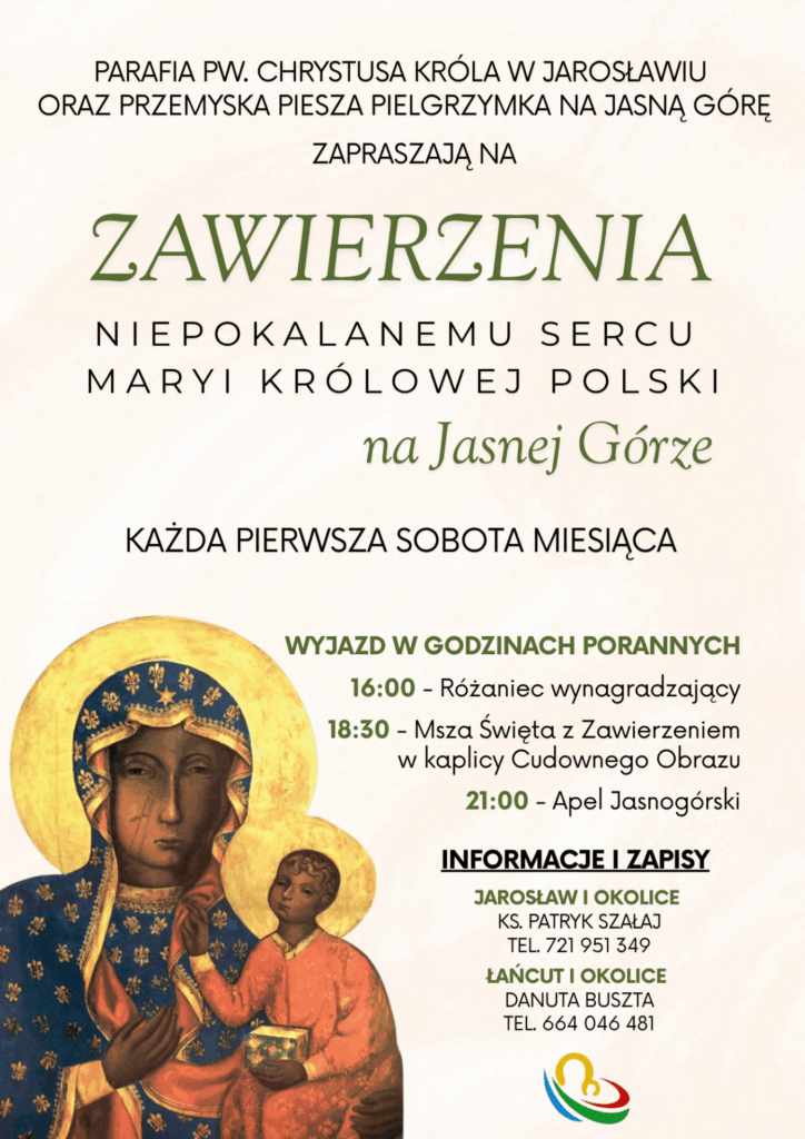 Zapraszamy na wyjazdy na Jasna Góra w każdą pierwszą sobotę miesiąca – czas szczególnej modlitwy i zawierzenia Niepokalanemu Sercu Maryi. To spotkania, podczas których możesz powierzyć Bogu przez Maryję swoje życie, rodzinę, troski i pragnienia, doświadczając pokoju i duchowego umocnienia.